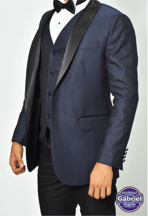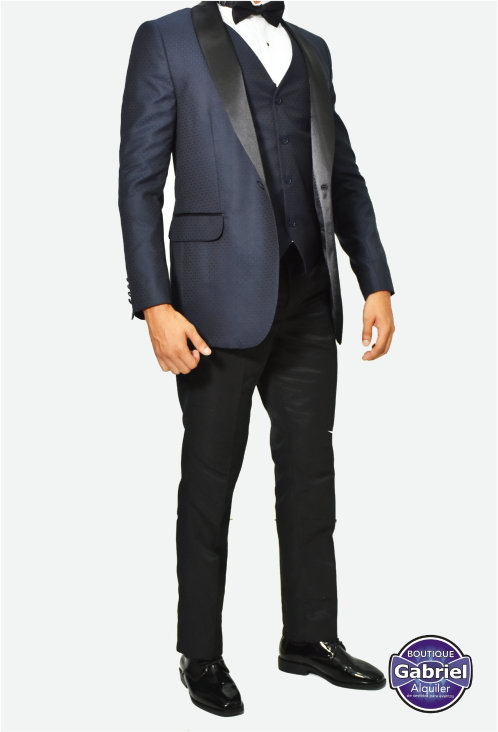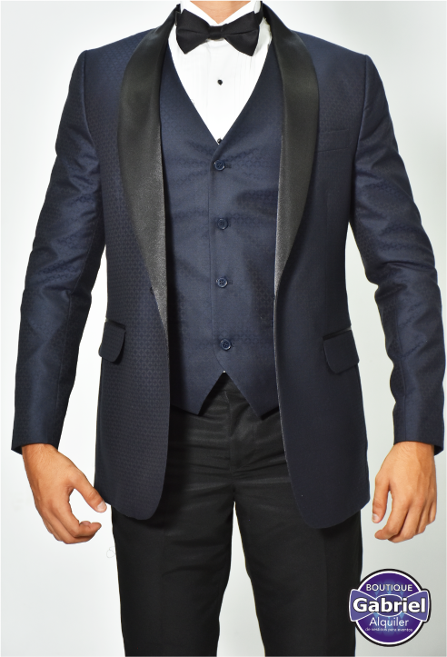 Saco de 1 con solapa clásica redonda satinada. Corbatín negro y faja o chaleco dependiendo el modelo. Camisa blanca de smoking cuello de pajarito. Pantalón negro.